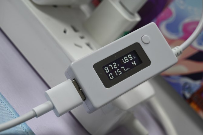 首先公牛移动电源(快充版)拥有反向快充技术,所以我们特意找了一个支持9V2A的充电头为公牛移动电源(快充版)进行充电。经测试,电压为8.72V,电流为1.89A,基本与官方给出的参考数据保持了一致性。